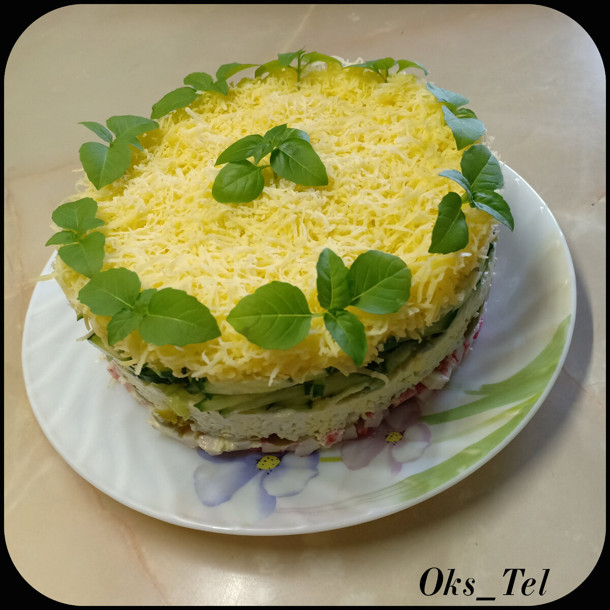 Рецепт взят из интернета. Салатик очень нежный, но вместо оливок я бы положила слой маринованного лучка. Начинаю публиковать серию "именных" салатов. ПОНАДОБИТСЯ: - 200г крабовых палочек, - 3 яйца, сваренных вкрутую, - 200г голландского сыра, - 1 баночка оливок (400мл), - 2 небольших свежих огурца, - по вкусу - майонез. ПРИГОТОВЛЕНИЕ: 1. Крабовые палочки мелко порезать. Уложить равномерным слоем на блюдо и смазать майонезом. 2. Оливки нарезать небольшими кружочками, выложить на крабовые палочки. 3. Яйца натереть на терке на слой оливок, смазать майонезом. 4. Огурцы нарезать тонкой соломкой, выложить на яичный слой, смазать майонезом. 5. Сыр натереть на мелкой терке и выложить на огуречный слой. Приятного аппетита! #салат #слоеныйсалат #салатскрабовымипалочками #салатсоливками #салатсогурцами #салатссыром #салатсяйцами #новыйгод #праздничныйстол #напраздничныйстол