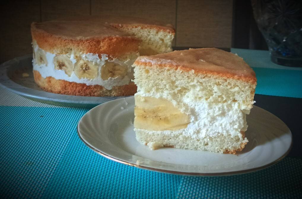Очень вкусный и лёгкий десерт Ингредиенты: Бисквит:, мука пшеничная, яйца, сахар, сок фруктовый (сироп) , Творожный слой, творога (в брикете), йогурт греческий, желатин, банана, сахара, молока, Заливка, пюре фруктового (у меня яблоко-банан), желатина, воды, сахар по желанию Способ приготовления: Испечь бисквит в форме 20-22 см (или потом обрезать по кругу). Можно сделать заранее, накануне. Взбить яйца с сахаром до пышной пены, ввести муку перемешивая с низу в вверх. Разрезать бисквит пополам, половину уложить в форму, установить кольцо. Пропитать соком. Для творожного слоя творог и йогурт комнатной температуры. Желатин замочить в молоке. Тем временем взбить творог, йогурт и сахар блендером. Подогреть желатин до растворения, добавить к творожной массе и взбить. На бисквит выложить немного начинки, разместить бананы целые и кружочки по бортикам. Убрать на полчаса в холодильник. Затем вылить сверху оставшуюся начинку, разровнять и накрыть половиной бисквита. Для заливки замочить желатин в