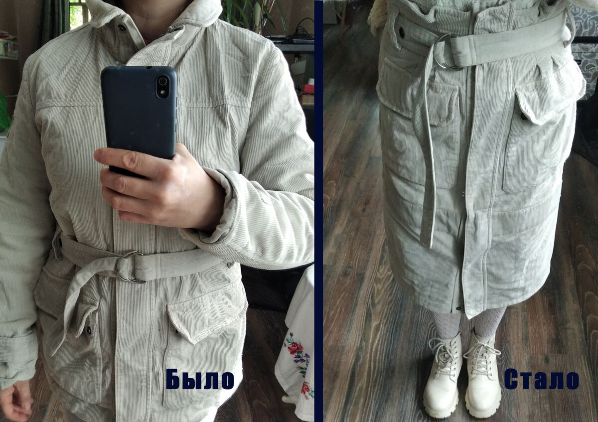 Надоела мне вельветовая куртка - и все. Кажется, что она мою фигуру превращает в квадрат. Но не выкидывать же вещь! Перешью ее... в юбку! У куртки мне нравились объемные карманы и пояс со шлевками. Значит надо их оставить! И конечно, мне нужна планка с клепками. Поэтому отпарываем планку и отрезаем верхнюю часть куртки. По подолу куртки была пришита обтачка из клевого бежевого брезента - ее тоже не буду трогать. Оставим все лучшее! Теперь из рукавов выкраиваем детали низа. Раз и два. Хватит, но не на всю длину. Частично придется кроить из спинки "хвостик" около шлицы (ну и саму шлицу). Притачиваем нижние детали, планку спереди и подгибаем верхний срез. Теперь самое интересное - надо сделать убавления в области талии. Измеряем талию (76 см) и длину полотна (98 см). Вычитанием определяем разницу (98 - 76 = 22) Так как я решила сделать 4 вытачки на заднем полотне (по 2 с каждой стороны) и 4 защипа спереди (по 2 на каждую планку), то лишние сантиметры делим сразу на 8 (22 : 8 = 2,75).