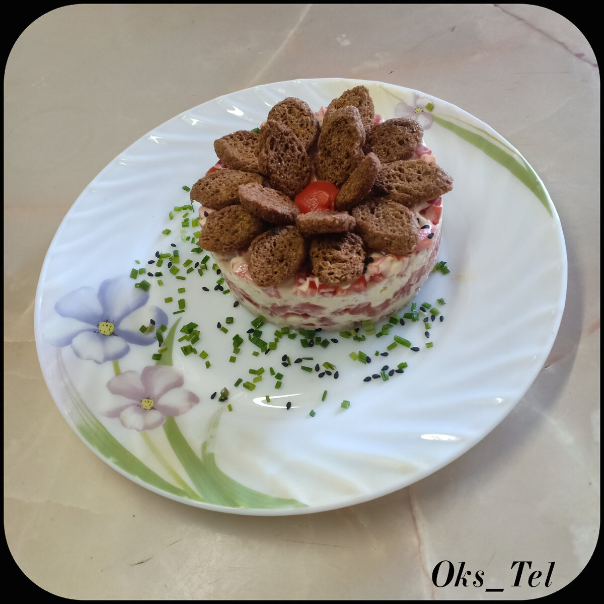 Легкий и свежий салатик, с небольшой остринкой, как раз под весеннее настроение! ПОНАДОБИТСЯ: - 1/2 отварной куриной грудки, - 2 средних помидора, - 2-4 зубчика чеснока, - 4 яйца, сваренных вкрутую, - 1 красный болгарский перец, - 1 упаковка сухариков, - по вкусу - соль, - майонез. ПРИГОТОВЛЕНИЕ: 1. Куриную грудку мелко порезать. 2. Помидоры нарезать небольшими кубиками, посолить. Чеснок мелко измельчить и смешать с помидорами. 3. Яйца натереть на средней терке. 4. Сладкий перец нарезать кубиками. 5. Салат выложить слоями, промазывая каждый слой майонезом: - куриная грудка, - помидоры с чесноком, - измельченные яйца, - сладкий перец, - сухарики. Приятного аппетита! #салат #слоеныйсалат #салатскурицей #салатсперцем #салатспомидорами #салдатссухариками #салатсяйцами #новыйгод #праздничныйстол #напраздничныйстол