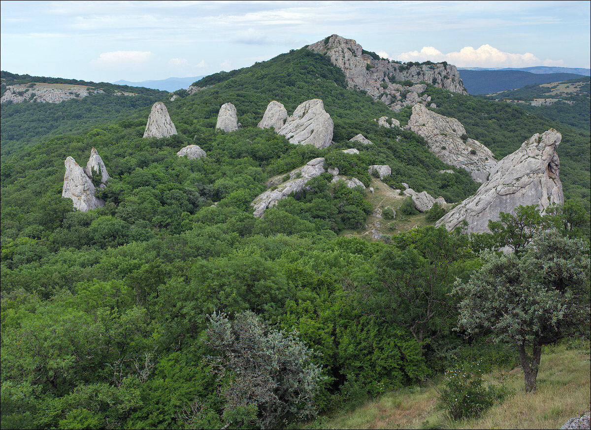 Рядом с этим загадочным местом мы планировали провести ночь — благо, недалеко оттуда был обещан родник. Правда, имеющий обыкновение летом пересыхать — но мы склонны были надеяться на лучшее. Пока же нам было предоставлено удовольствие любоваться издали могучими каменными лепестками, вспарывающими волны густого горного леса — словно плавники исполинской акулы…