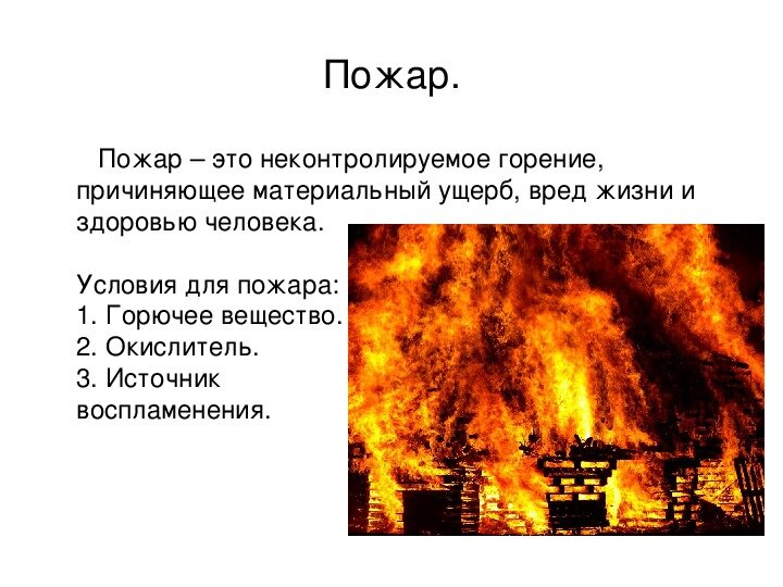 Что такое пожар? Ниже Вы увидите определение данного слова и условия для горения. При обнаружении возгорания в первую очередь надо звонить в пожарно-спасательную службы по телефону «101» или «112». Стоит учитывать тот факт, что вовремя обнаруженный пожар зачастую можно ликвидировать своими силами. Поэтому пока пожарные подразделения следуют к вам на помощь попробуйте предпринять попытки к тушению. Важно: приступайте к тушению только в том случае, если это не будет угрожать вашей жизни и здоровью. При пользовании огнетушителем, необходимо ознакомиться с правилами его использования, если же огнетушителя нет – воспользуйтесь подручным материалом. Первое, что приходит в голову - это вода. Вода издавна применяется людьми для тушения пожара. Попадая на горящий предмет, она охлаждает его. А образующийся водяной пар вытесняет кислород из зоны горения. Важно знать и помнить, что нельзя тушить водой электроприборы под напряжением. Сначала их надо обесточить, а уже потом приступать к тушению. К