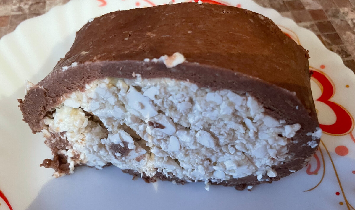Предлагаем вашему вниманию рецепт рулета с творожно-банановой начинкой. Готовится он практически за считанные минуты, а самое главное для его приготовления вам не понадобится духовка. Ингредиенты • 400 гр песочного печенья. • 700 гр нежирного творога. • 1 банан. • 200 мл молока. • 100 гр масла сливочного. • 4 ложки столовые какао. • Сахар добавляем по вкусу. Приготовление 1. Измельчаем печенье в блендере в мелкую крошку. 2. Добавляем в печенье какао и все тщательно перемешиваем. Выливаем молоко (холодное) и вновь перемешиваем. В результате должно получиться слегка влажное “тесто”. При перемешивании убедитесь в отсутствии кусочков печенья. Если они есть, разомните их. 3. В другой миске смешиваем творог с растопленным маслом и добавляем в него сахар. 4. В блендере измельчаем банан и добавляем его в творог. Всё перемешиваем. 5. На пищевую плёнку выкладываем "тесто" из печенья. Раскатываем его в тонкий слой. 6. Выкладываем на "тесто" творожно-банановую начинку и аккуратно сворачиваем его