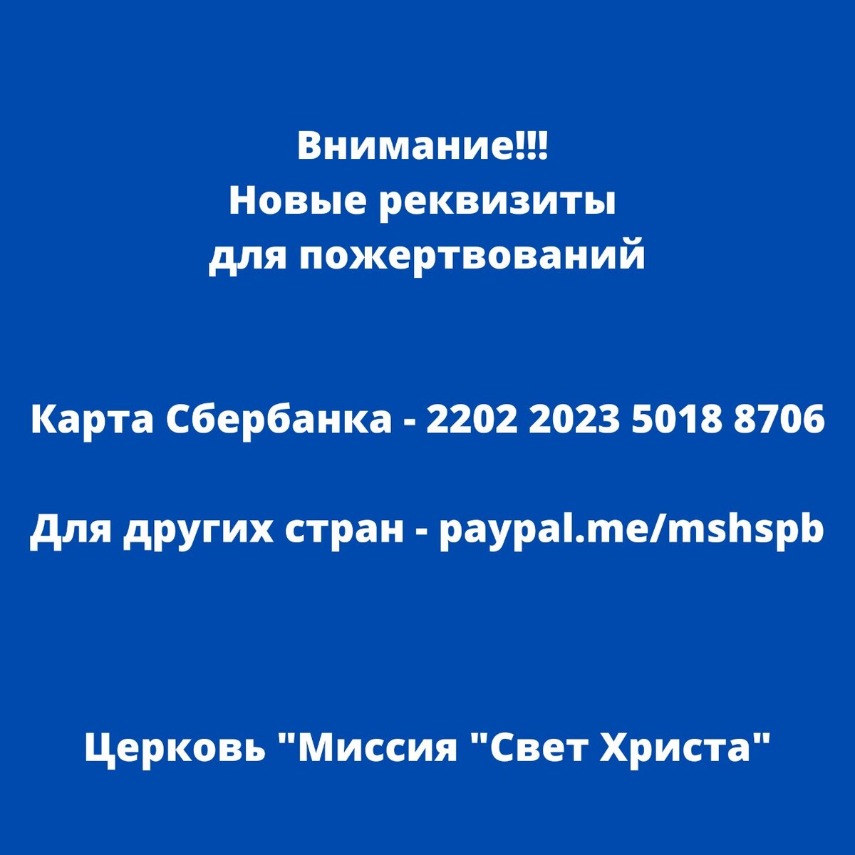 Внимание!!! Новые реквизиты для пожертвований! церковь "Миссия "Свет Христа" * Карта Сбербанка - 2202 2023 5018 8706 * ❗Для других стран - https://www.paypal.me/mshspb (paypal на имя - Елена Милованова)