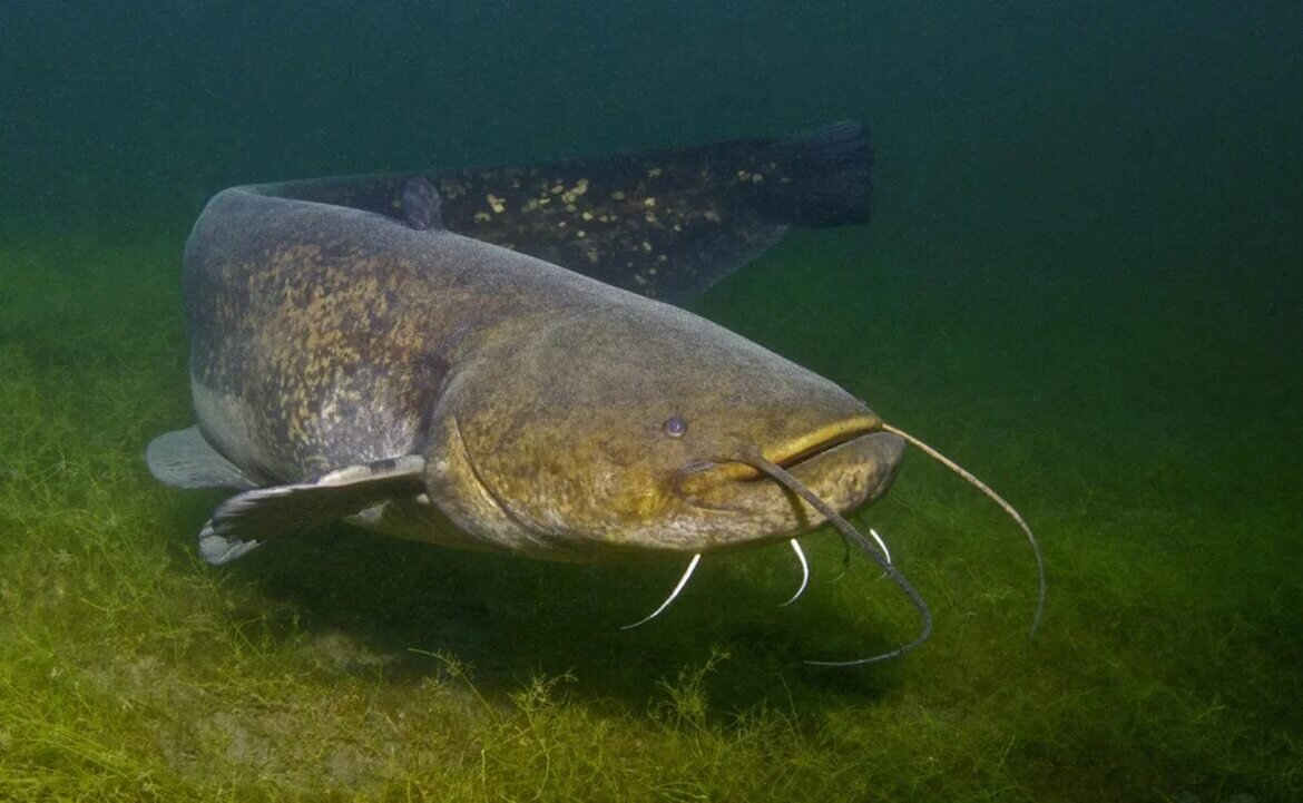 Хищник может иметь разный окрас. Это в первую очередь зависит от времени года и мест его обитания. Но чаще всего сом имеет тёмно-серый цвет с оттенками чёрного и зелёного. Брюшко обычно грязно-белого окраса. У сома широкая огромная голова, она как бы немного сплющена сверху вниз. В массивных челюстях находится очень много мелких и острых как бритва зубов. По обеим сторонам верхней губы располагаются два длинных уса, и ещё четыре коротких — на подбородке. На голове расположены небольшие для таких размеров рыбы глазки (они словно опущены). Рыба имеет большое и мощное тело без чешуи, покрытое только голой кожей в слизи, благодаря этому сом легко скользит в толще воды. Спинной плавник небольшой, анальный же, наоборот, крупный и широкий, переходящий в хвостовой. Большую часть тела занимает мощный хвост из сильных, мышц. Тело сома может достигать длины в 3−4 метра, а вес — 300−400 кг. Но такие крупные особи попадаются крайне редко, чаще всего это байки рыбаков. Обычный вес выловленного хищни