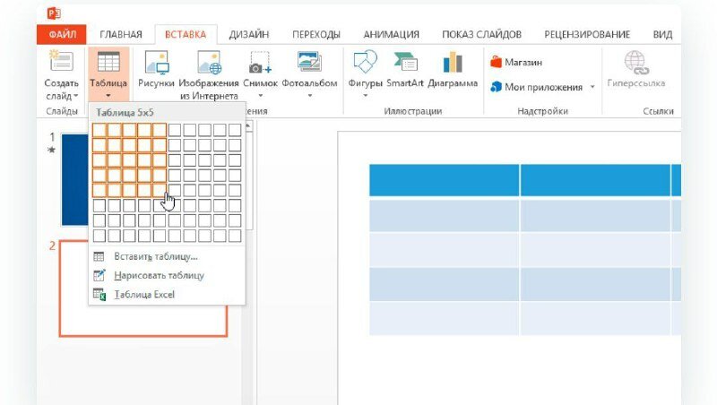 - Создайте новый слайд и добавьте на него таблицу (Вставка → Таблица).