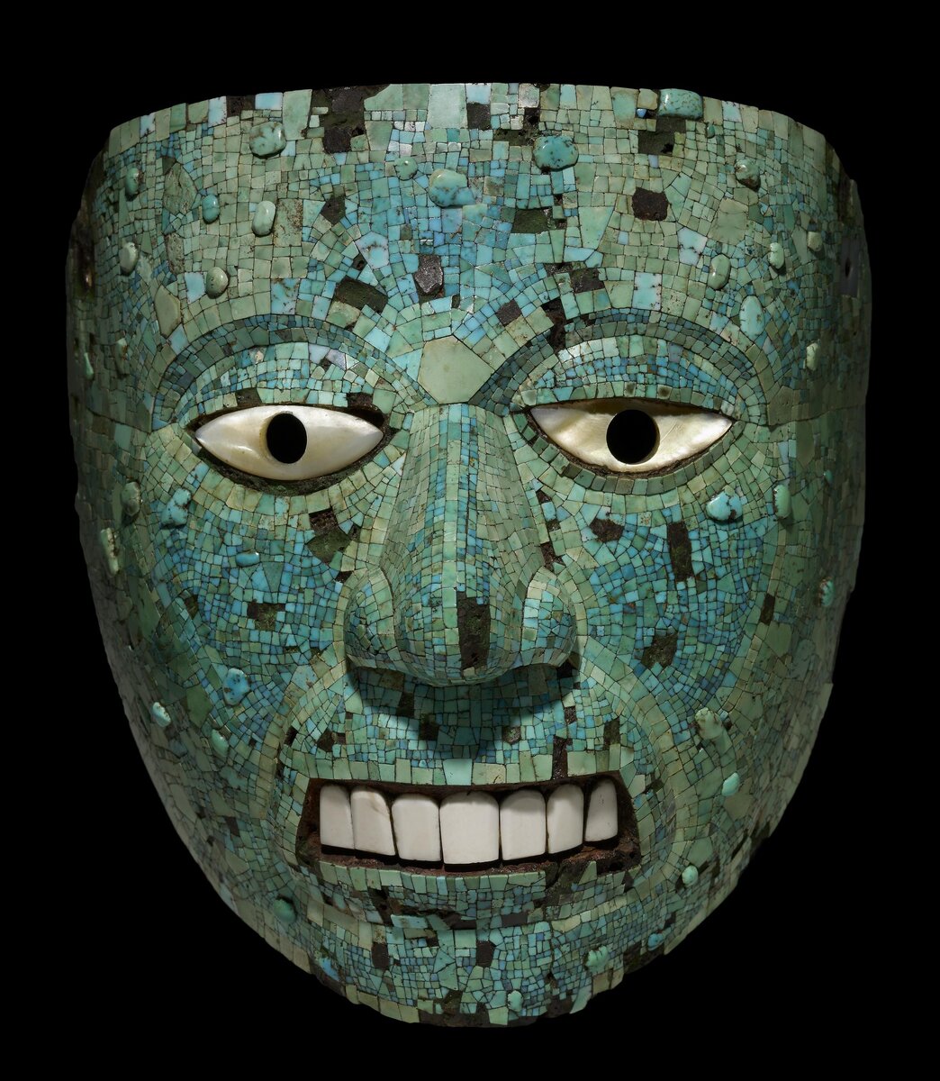 Ещё одна ацтекская маска из мозаики, вероятно, использовавшаяся во время кровавых жертвоприношений. Эта маска, вероятно, изображает ацтекского бога огня Шиутекутли. Выполнено изделие из кедра (лат. Cedrela odorata) и покрыта бирюзовой мозаикой. Также, помимо плоской мозаики маска покрыта бирюзовыми кабошонами. Проколотые эллиптические глаза выполнены из перламутра моллюска Pinctada mazatlanica, а зубы из раковины Стромбуса, два из которых являются современными синтетическими заменителями. Веки маски были позолочены, а внутренняя поверхность окрашена киноварью. Отверстия на висках указывают на то, что маска предназначалась для ношения на лице во время ритуалов жертвоприношений или, возможно, была привязана к другому предмету. Исследования показали, что золото на веках было нанесено в виде тонкой фольги толщиной около одной сотой миллиметра. Использование рельефных бирюзовых кабошонов создает эффект бородавок. Из-за «бородавок» было высказано предположение, что эта маска на самом деле мо