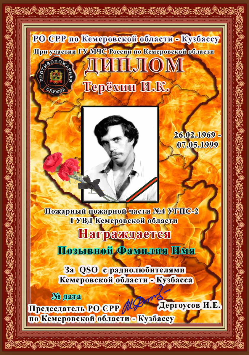 Положение диплома «Терёхин И.К.» Диплом «Терёхин И.К.» учреждён региональным отделением Союза радиолюбителей России по Кемеровской области – Кузбасса при участии ГУ МЧС России по Кемеровской области - Кузбассу. Входит в дипломную программу «Огнеборцы Кузбасса», серия «Книга памяти». Терёхин Игорь Константинович пожарный пожарной части № 4 ОГПС -2 ГУВД Кемеровской области. Родился 26 февраля 1969 года в г. Анжеро-Судженск Кемеровской области. Погиб 07 мая 1999 года. Подробности по ссылке: https://memory.mchs.gov.ru/persons/343 Диплом выдается радиолюбителям Российской федерации и странам ближнего зарубежья. Для его получения необходимо набрать: в 2022 - 53 очка, в 2023 году - 54 очка и т.д. за радиосвязи, проведенные с радиолюбителями Кемеровской области - Кузбасса. Начисление очков производится следующим образом: - связи с радиолюбителями Кемеровской области - Кузбасса дают по 1 очко; - связи с радиолюбителями - членами СРР из Кемеровской области - Кузбасса, дают по 2 очка (Список опуб