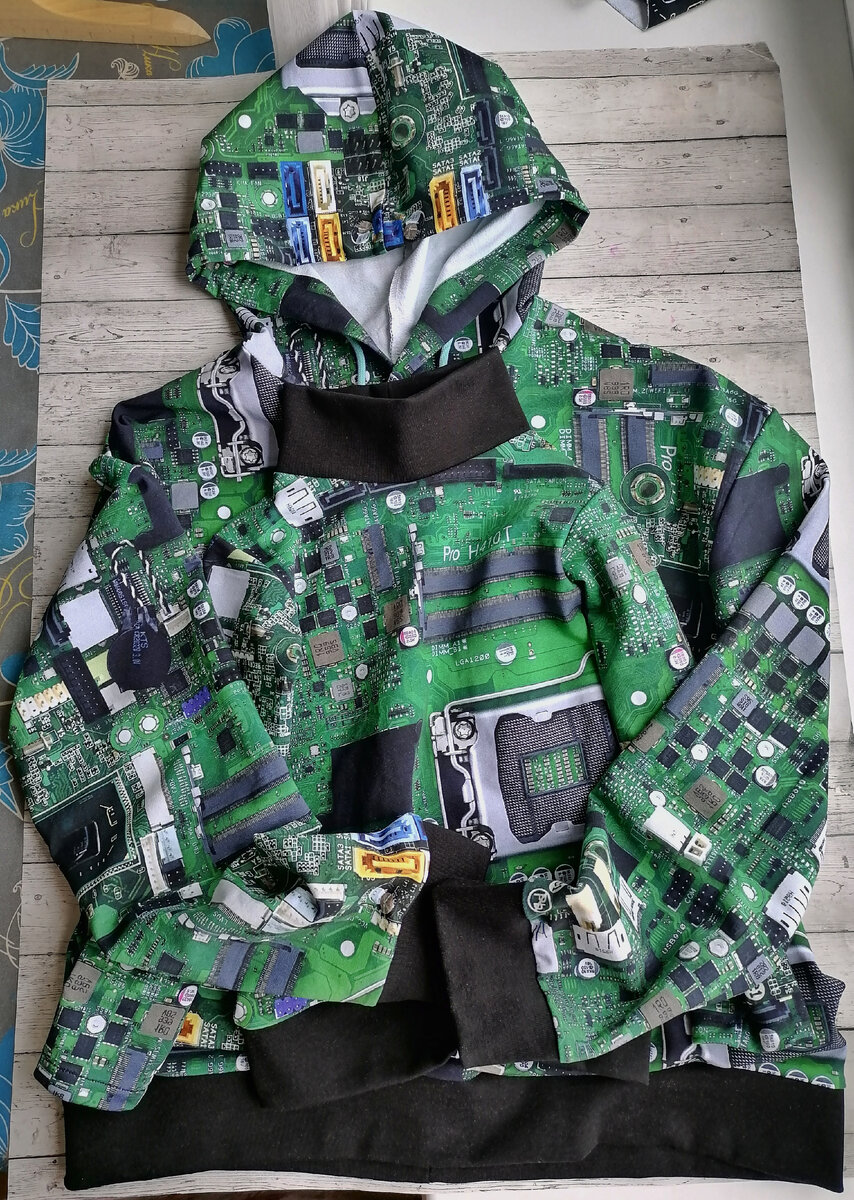 Рубрика "разминка для глаз": найди два разных изделия на фото 😊 Втихаря сшила костюмы роботов для мужа и сына ☺️ Взрослое худи с капюшоном - выкройка худи Брэд VikiSews https://vikisews.com/vykrojki/muzhskie-vykrojki/hudi-bred/ Детская водолазка - пересняла с уже имеющейся 😉 Прекрасный футер двунитка и чёрная рибана от тканей Галины O'Cotton https://vk.com/tkani_ocotton Это первое изделие, жданное мужем, всё из-за принта 🙂 Теперь бы заснять радостную примерку 🙈