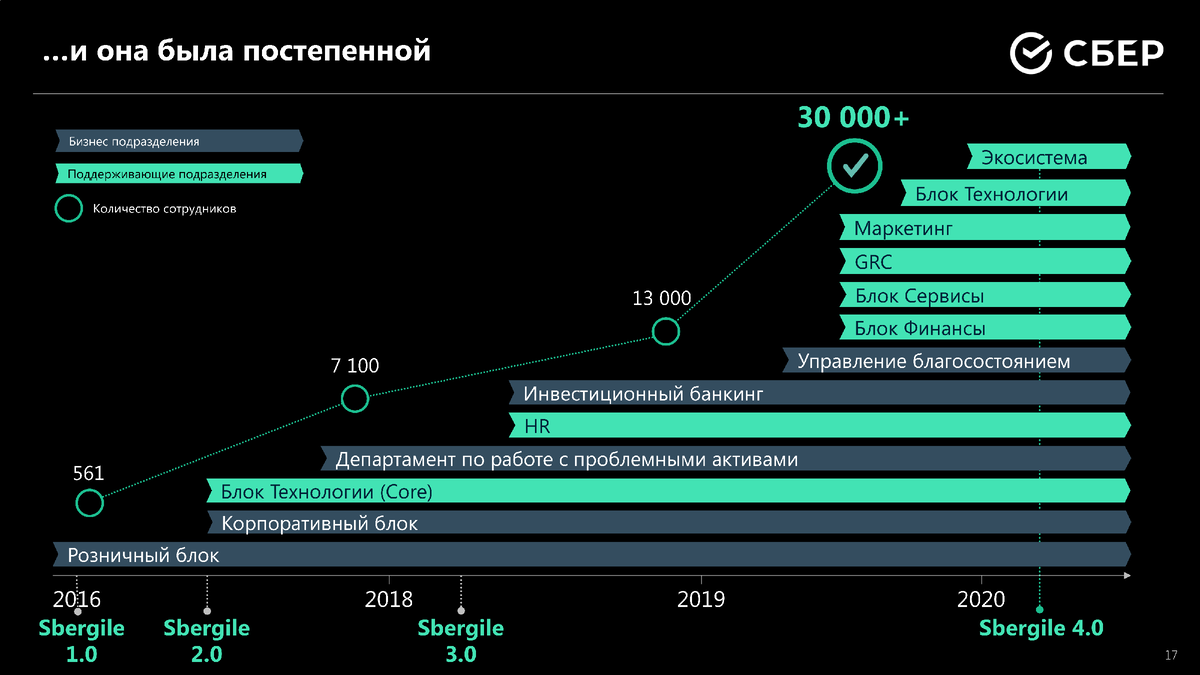 Повествование о том, как вложить миллиард и получить триллион чистой прибыли и изменить мнения о корпорации зла. В конце мая 2022 г. посетил с экскурсией Agile home компании Сбер в г. Москва. Не знаю ещё, как правильно описывать такие события, поэтому буду писать как будто, я общаюсь с Вами в живую. В 2021 г. с интересом смотрел конференцию Сбербанка по трансформации с помощью концепции Agile. Кто бы мог подумать, что через какой-то время я смогу оказаться в их офисе. Удивительно. Выступало 2 сотрудника – 2 руководителя. Извините, но я не смог их запомнить по ФИО и должностям, но это точно не последние сотрудники в структуре. Программа была классическая: выступление, экскурсия по офису. Выступление докладчиков Путь трансформации был начат в 2008 г. С 2008 г. по 2016 г. наводился порядок, скажем так, в процессах. И с 2016 г. началась трансформация Agile. Пока не наведёте порядок в процессах бизнеса, то нет смысла заниматься Agile. Такой подход применили в Сбере и сейчас не стыдно показа