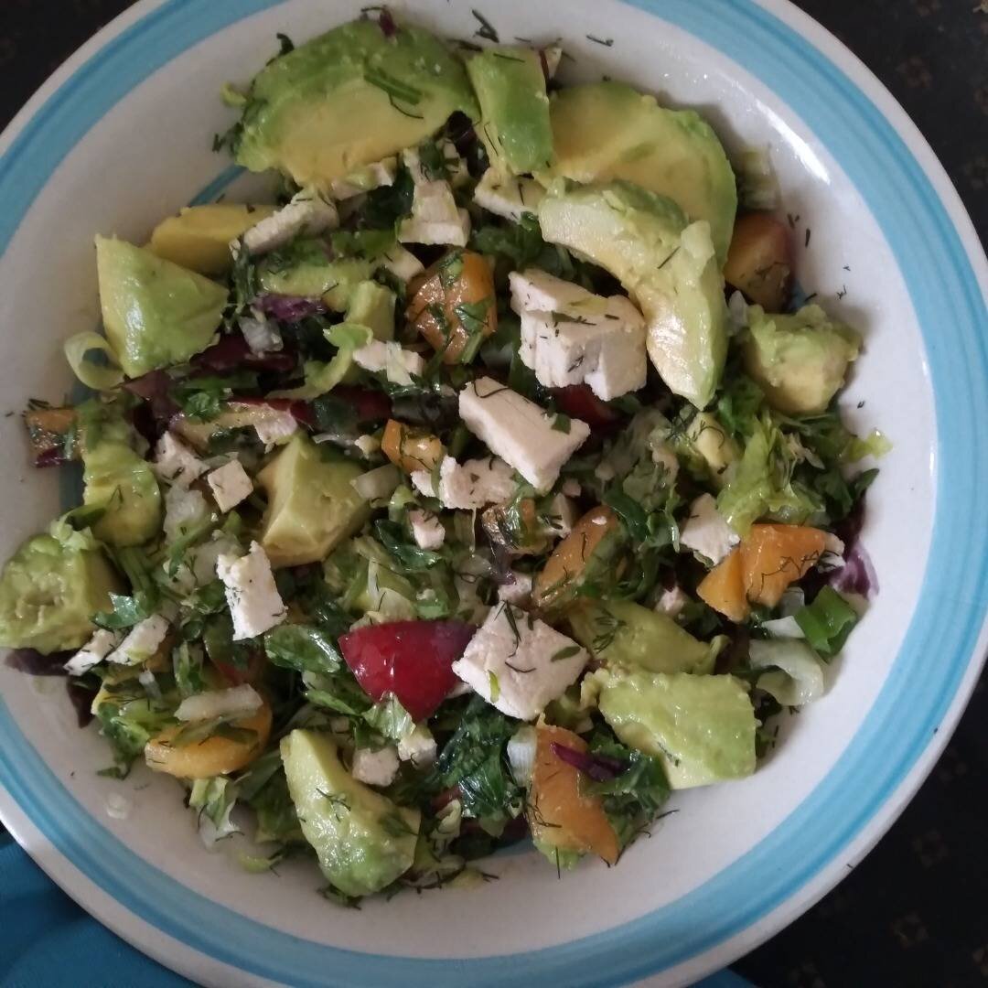#пп Этот салат можно использовать и как завтрак и как легкий ужин. Ингредиенты: зеленого салата, смеси молодых салатных листьев (у меня свекольные с рукколой), тофу, нарезанного зеленого лука, нарезанных петрушки с укропом, персик, нектарина, оливкового масла, лимонного сока, чеснока, натертый, небольшой авокадо, соль , черный молотый перец Способ приготовления: В салатницу нарезать салатные листья. Добавить зеленый лук, натертый чеснок и петрушку с укропом. Положить нарезанный авокадо. Добавить нарезанные тофу и фрукты. Заправить оливковым маслом, лимонным соком. Перемешать, отрегулировав вкус с помощью соли и черного молотого перца. Приятного аппетита!