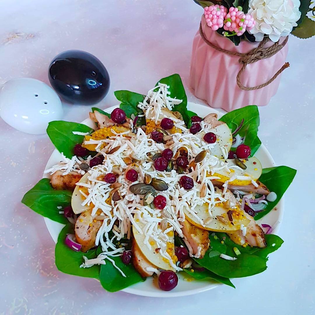 Салат со шпинатом, грушей и филе бедра цыплёнка