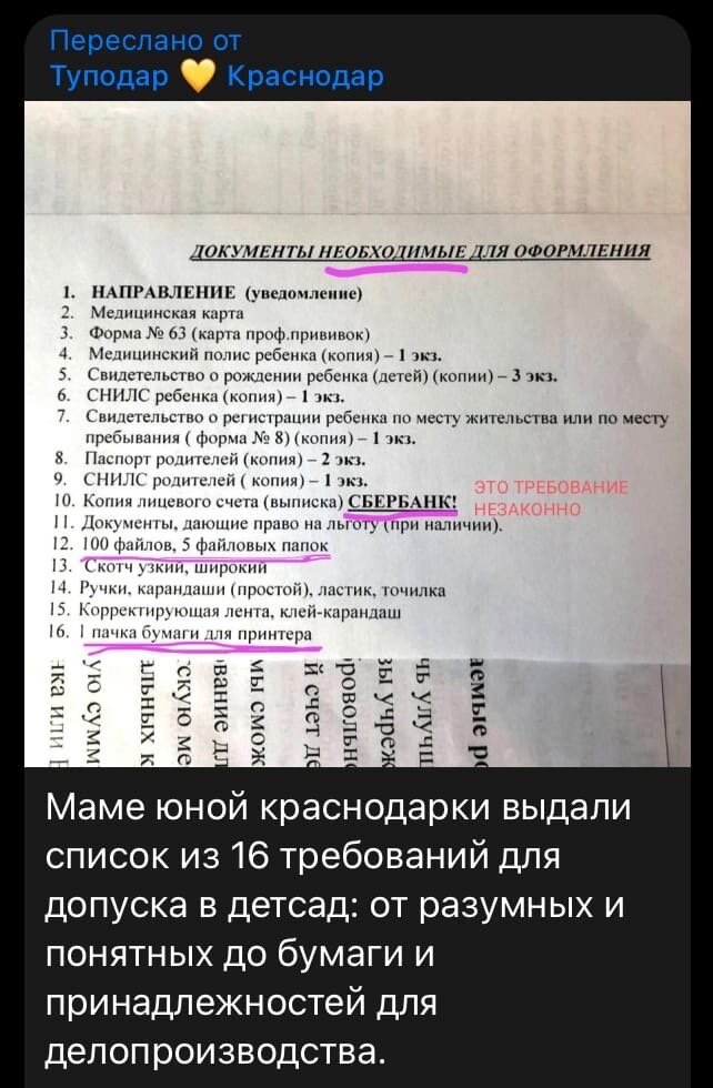 Эту информацию мне прислали из нашего городского паблика в социальных сетях. Как утверждается, на фотографии список требований для оформления ребенка в детский сад. Самые странные требования из списка, это выписка лицевого счета в Сбербанке, 100 файлов и пачка бумаги для принтера. Нужно ли сдавать канцелярские товары в государственный садик? Если посмотреть комментарии к упомянутому посту, то можно заметить как сильно общество разделилось по этому вопросу! Одни утверждают, что государственные садики должны быть полностью бесплатными, и речи не может быть о сдаче канцтоваров или денег на покупку оного. Другие считают, что садам сейчас очень трудно приходится, поэтому ничего плохого в таких "просьбах" не видят. Сдают всё что нужно, и еще сверху, если попросят. Кто-то писал о покупке постельного белья в детский сад при поступлении и стирке в домашних условиях. Хотя, некоторые отметили, что такая нехватка канцтоваров, это в первую очередь упущение руководителей детского сада, которые долж