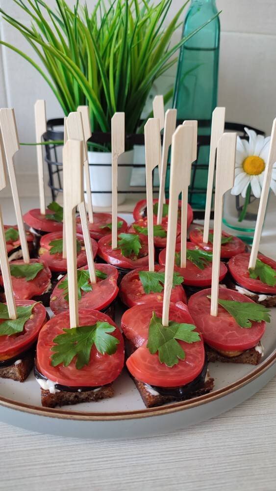 #летнееменю Яркая, интересная, летняя закуска😀 Ингредиенты: Баклажан , Помидоры , Хлеб или батон, Чеснок , Майонез, Подсолнечное масло для жарки Способ приготовления: Хлеб порезать на четвертинки, обжарить с двух сторон в масле. Второй вариант батон посушить мин 10 в духовке. Баклажаны нарезать на кружочки, посолить и залить водой на 20 мин. Затем вынуть из воды и высушить салфетками. Обжарить с двух сторон на подсолнечном масле. Помидоры порезать тонкими кружочками. Чеснок потереть на тёрке и добавить в майонез, перемешать. Складываем бутерброд. На хлеб намазываем майонез с чесноком, затем кладем колечко баклажана, сверху кружок помидорки. Можно украсить зеленью, вставить шпажки. Приятного аппетита🤗.