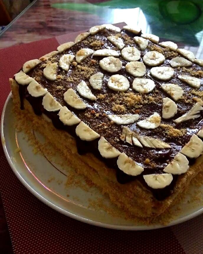 Я приветствую вас с пожеланиями всего самого доброго! Когда есть настроение, хочется творить. Предлагаю незатейливое приготовление торта без выпечки. Пробовала разные варианты, но прижился именно этот. Надеюсь, вам он тоже придется по вкусу. Ингредиенты: Шоколад для украшения, можно крошкой печенья и бананами (на любой вкус) В начале приготовим крем. Большую часть молока переливаем в кастрюльку, в которой на огне будем делать крем. Оставляем молока 200 г. Ставим на небольшой огонь молоко. А в кастрюлю поменьше вбиваем яйца и взбиваем их, добавляя обычный и ванильный сахар и все хорошо перемешиваем, оставляем массу. В отдельной посуде соединяем крахмал и муку и всыпаем к смеси с яйцами, все снова перемешиваем до однородности без комочков и вводим остаток молока, перемешиваем. Эту однородную яичную жидкость вводим в почти закипевшее молоко. Массу нужно постоянно перемешивать до закипания. Делаем огонь меньше и пусть масса покипит 3-4 мин. Крем получился однородным, снимаем его с огня. Сл