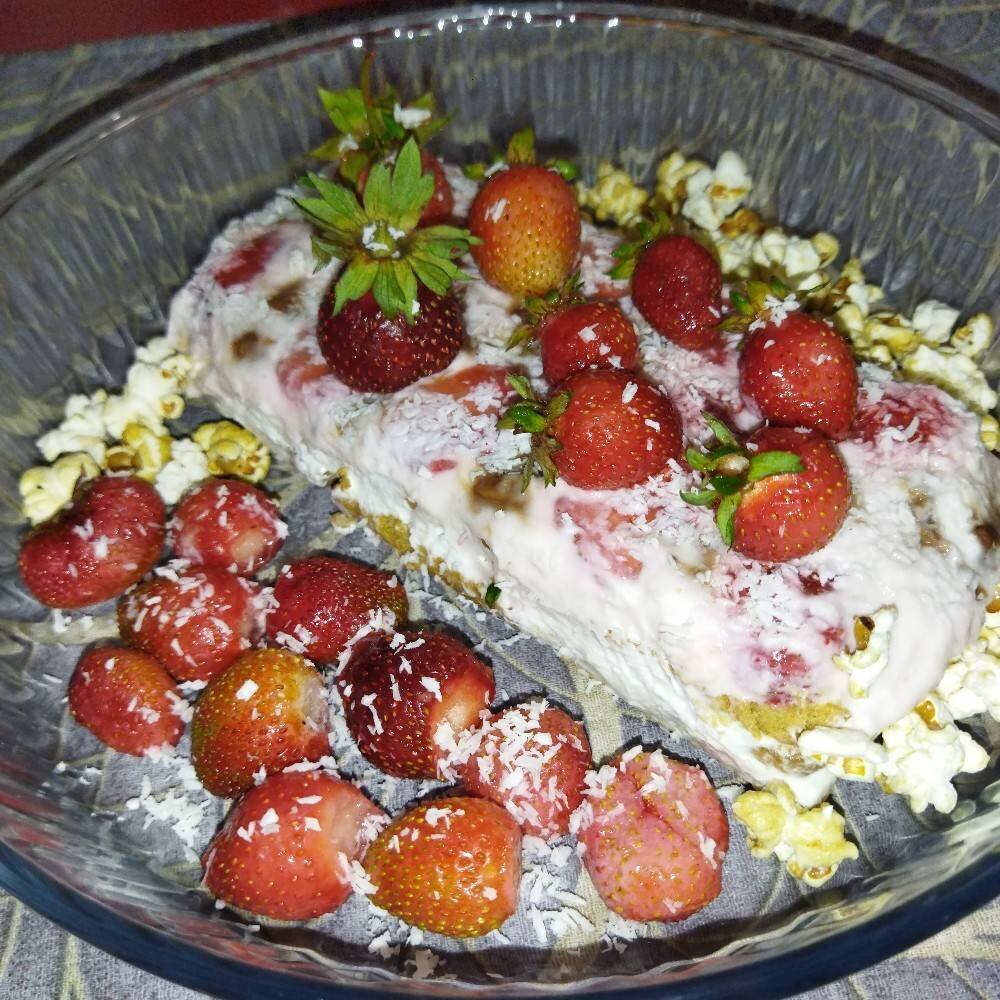 #ягоды #летнееменю В рецептуре не указываю количество ингредиентов, ведь каждый будет готовить индивидуальным размером этот тортик! Удачи, дерзайте💐🤗! Ингредиенты: Ягода свежая , Печенье, Печенье, Конфетки, Йогурт (лучше пожирнее 8%), Снежок (можно ряженку, йогурт), Паста творожная (вкус на усмотрение), Кокосовая стружка, Попкорн сладкий для украшения Способ приготовления: Приготовить ингредиенты. Застелить форму (любую) плëнкой пищевой. Собрать тортик слоями. *1-Посыпать на дно кокосовую стружку, покрошить конфетки. *2-Затем выложить разрезанные пополам ягодки. 3-Промазать сверху ягодки йогуртом. *4-Выложить слой сладкого печенья. *5-Залить,,Снежком" достаточным количеством, чтобы пропитались нижние слои. 6-Печенье обильно промазать творожной пастой. *7-Выложить заключительный слой -печеньками промазанной стороной на предыдущий слой, немного придавить руками. *Поставить в холодильник пропитываться на 4 часа. Достать из холодильника. *Выложить из формы за края пищевой плëнки. *Помест