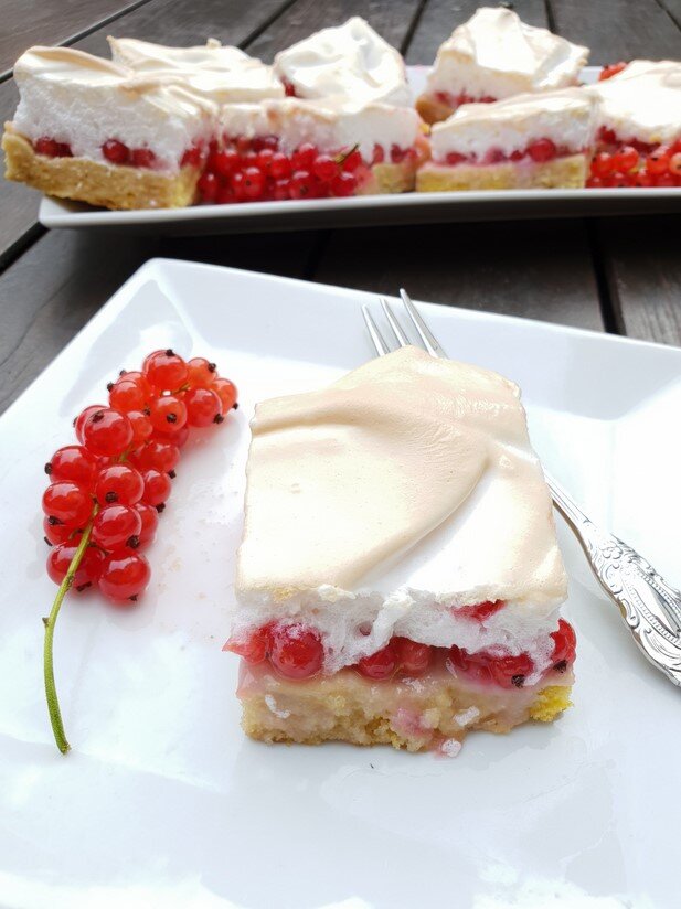 Фруктовый кисло-сладкий пирог из сочной смородины с безе Ингредиенты · 500 грамм красной смородины · 210 грамм сахарной пудры · 1 пакетик ванильного сахара · 5 яиц (отделить желток от белка!) · 4 столовые ложки воды · 80 грамм мягкого сливочного масла · 330 грамм муки · 1/2 пакетика разрыхлителя · Молоко по необходимости Рецепт 1) Разогрейте духовку до 180 градусов. 2) Смешайте желтки, муку, ванильный сахар, разрыхлитель, масло и воду до однородного теста. При необходимости добавьте немного молока. 3) Взбейте сахарную пудру и яичные белки до образования пены. 4) Выпекайте тесто на высоком противне в духовке при температуре 180 градусов около 12 минут до золотисто-коричневого цвета. Выньте из духовки. 5) Равномерно распределите промытую смородину по тесту. 6) Покройте смородину взбитыми яичными белками - безе 7) Поставьте противень обратно в духовку и выпекайте еще 12 минут до золотисто-коричневого цвета. 8) Охладите и наслаждайтесь. Приятного аппетита!