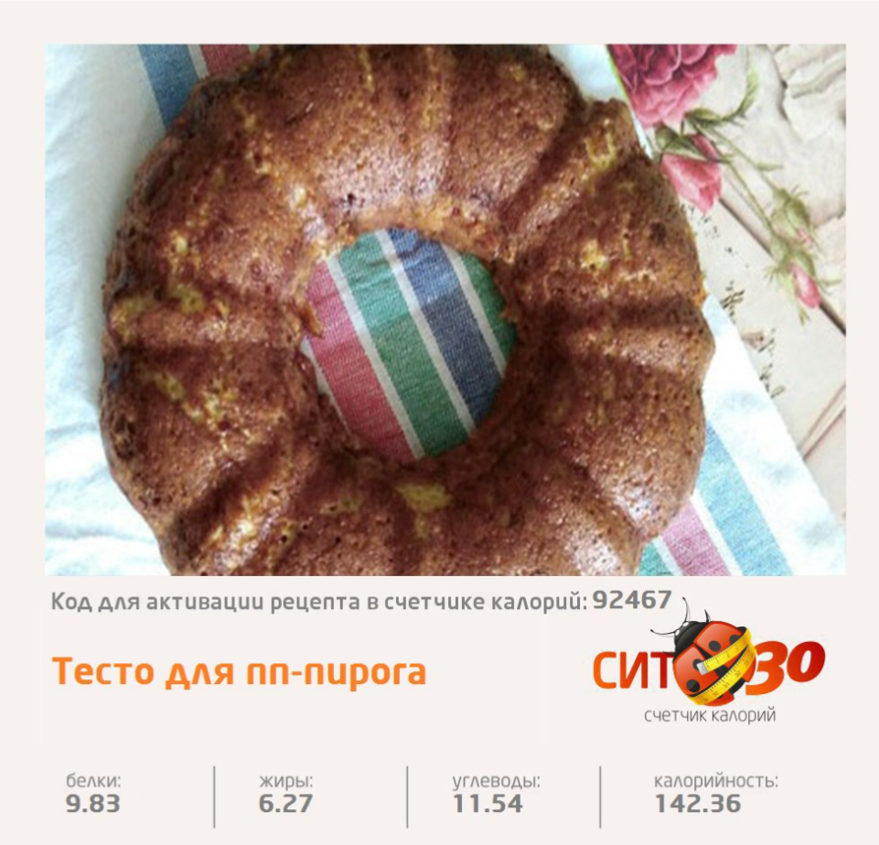 Тесто для ПП пирога Ингредиенты: 2 ст. л. овсяных отрубей, 2 ст. л. пшеничных отрубей, 3 яйца, 4 ст. л. кефира, 100 г рикотты (вместо рикотты можно измельчить сухой творог), соль и сахзам, 1 ч. л. Разрыхлителя Приготовление: Начинку готовила из куриного фарша с луком. Но можно любую на ваш выбор. Все ингредиенты для теста хорошо смешать. Сначала в форме выпекается половина теста в духовке минут 10, потом вытащить - положить фарш и залить оставшимся тестом. И минут на 40 еще в духовку. Следить за вашим рационом питания поможет наш «Счетчик калорий СИТ30»: https://play.google.com/store/apps/details?id=net.sit.. Меню правильного питания на 30 дней можно найти в нашем мобильном приложении «Похудение с СИТ 30»: https://play.google.com/store/apps/details?id=com.sit..