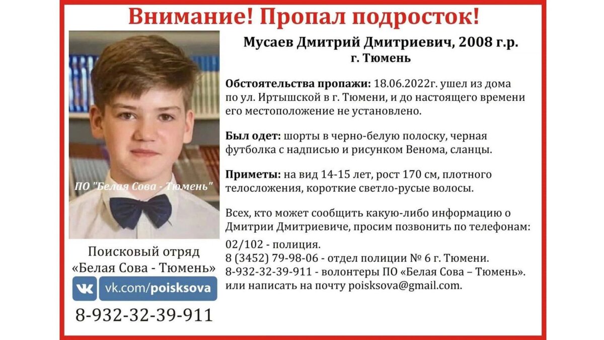 О местонахождении подростка нет информации со вчерашнего дня. В столице тюменского региона волонтеры развернули поиски 14-летнего Димы Мусаева, который накануне, 18 июня, ушел из дома на Иртышской улице и с тех пор не выходил на связь с родителями, сообщает поисковый отряд «Белая сова». Мальчик был одет в полосатые черно-белые шорты, футболку с принтом Венома, на ногах — сланцы. Рост пропавшего 170 см, волосы светло-русые, короткие, телосложение плотное. Подростка ищут волонтеры поискового отряда «Белая Сова — Тюмень». Они просят всех, кто располагает информацией о местоположении Димы, выйти на связь — координаты в ориентировке. Ранее стало известно, что под Тюменью обнаружили тело пропавшего в начале мая местного жителя. Самые актуальные новости — в нашем Telegram-канале «Ямал-Медиа».