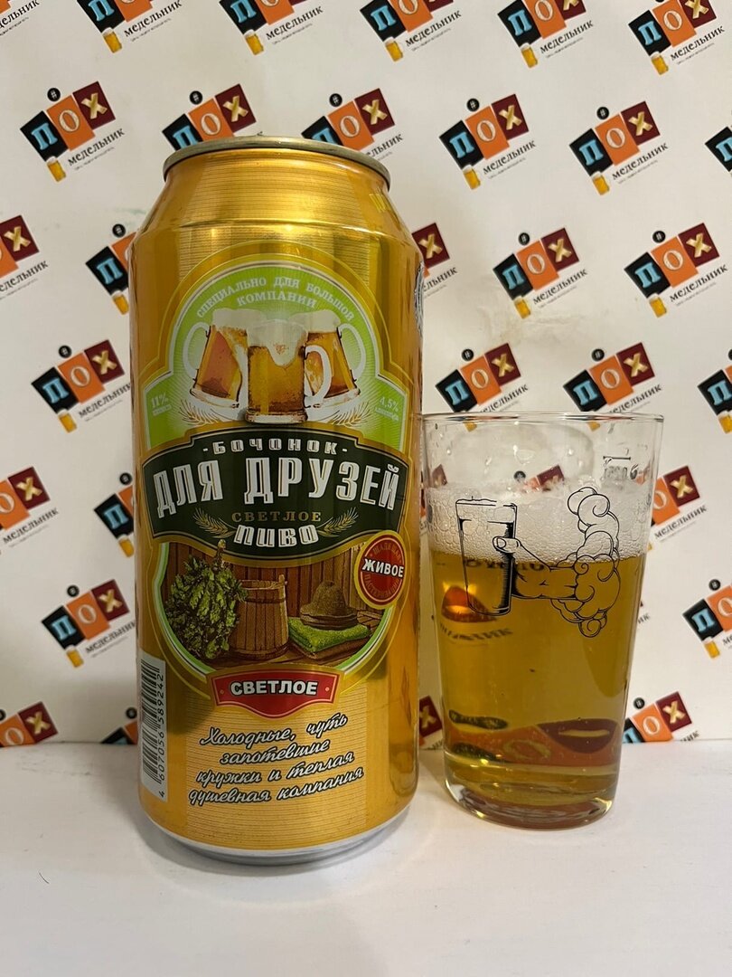 Статистика: пиво светлое пастеризованное фильтрованное, объёмная доля спирта - 4,5% об., экстрактивность начального сусла - 11%, состав: вода, солод пивоваренный ячменный светлый, хмель. Объём: 0,9 л Дата розлива: 21.04.2022 Изготовитель: ООО «Завод Трехсосенский», Россия, Самарская область, г. Самара. Адрес производства: Россия, Ульяновская область, г. Ульяновск По-братски: помню я как давным давно, примерно, могу ошибаться конечно, в году 2000-2001 «Балтика» начала продвигать банки размером 1 литр. Я тогда был студентом и подрабатывал и вот мы хлестали «балтийскую» троечку из таких банок. Потом помню Bud тоже был. Постепенно этот формат ушёл, хотя вот сейчас в «Ашане» я видел в 0,9 банках «Балтику 7». «Трехсосенский» не хочет быть в стороне и они тоже производят вот в таких банках своё пиво, гордо названное «Бочонок для друзей». Давайте выясним, что они хотят подсунуть друзьям. Аромат у него опять таки противный, какой-то дрожжевой, пенная шапка быстро сделала ноги, газация слабая, в