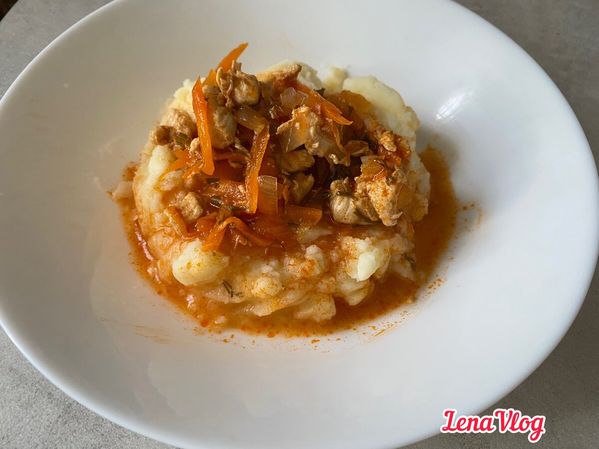 Готовим подливку из куриного фарша: Ингридиенты: 1.Обжариваем куриный фарш на сковороде с растительным маслом Готовим картофельное пюре: Ингредиенты: 1.Чтобы картофель быстрее сварился его нужно в класть в кипящую воду! Заранее поставьте кастрюлю с водой доведите до кипения. Очистите картошку, порежьте на большие куски, положите в кастрюлю, добавьте чайную ложку соли. Вода должна покрывать весь картофель,потом убавьте огонь и варите пока картошка не станет мягкой. Слейте воду. 2. Сливочное масло добавьте в картошку и разомните ее толкушкой. Когда масло полностью впитается, медленно вливайте горячее молоко, все время помешивая. Попробуйте, посолите, если нужно. Подаем картошечку с подливкой! Приятного аппетита!