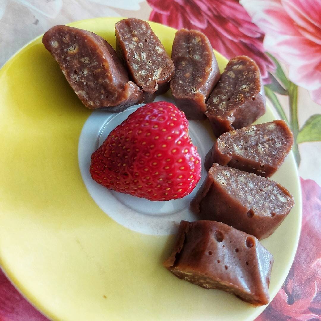 Рецепт вкусняхи из детства. Ингредиенты: Печенье 🍪, Сливочное масло, Какао, Сгущенка Способ приготовления: Инвентарь: Глубокая миска (Для перемешивания ингредиентов). Средняя миска (Толочь печенье). Скалка. Пергамент. Кастрюля и железная миска для паровой бани. Берём две миски, одна в которой будем смешивать ингредиенты, а вторая в которой будем толочь печенье скалкой. Ломаем поштучно печенье любыми кусками и толчем скалкой как можно мельче. Все печенье, которое мы перетолкли и ссыпали в самую глубокую нашу миску отставляем в сторону. На плиту ставим кастрюлю и наливаем воду, сверху устанавливаем железную миску в которую добавляем масло. Постепенно помешивая, растапливаем его полностью и в получившуюся жидкость высыпаем две ложки какао. Аккуратно сняв с плиты миску с маслом и какао, пока она горячая, быстро добавляем всю банку сгущенки и немного размешиваем. Получившуюся густую консистенцию выливаем в глубокую посуду с печеньем и тщательно доводим всё до однородной густой массы. Расст