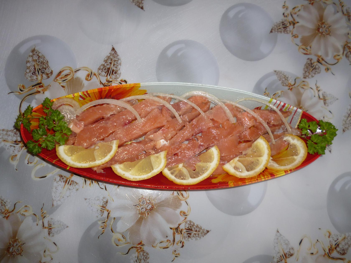 К столу подавать без костей и кожи, нарезку можно оформить луком и лимоном.