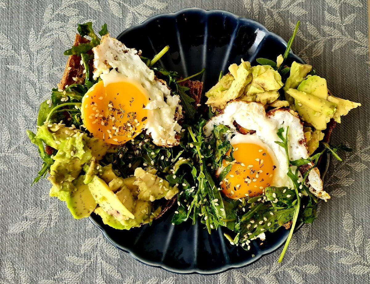 Смотрите, чтобы корочка была мягкой - это залог плавного укуса и того, что бутерброд будет приятным в процессе его поглощения, а не только красивым. Я беру ржаной на солодовой закваске. 2. Руккола Заправляем рукколу оливковым, кунжутным маслами и добавляем соевый соус, а также горчицу. Хорошо перемешиваем, вся трава должна пропитаться заправкой, чтобы яркий вкус самой рукколы был опережён вкусом заправки, а потом такой всплеск - сама руккола. Очень интересно получается. Выкладываем на хлеб, полностью закрываем поверхность. Заправка пропитает хлеб. 3. Яйца Хорошо прожарьте яйца, чтоб не осталось прозрачного белка. 4. Авокадо Берите только очень спелый авокадо и выкладывайте его на рукколу. 5. Посыпки Кунжутные семечки и сушеный базилик, соль. Очень просто и вк