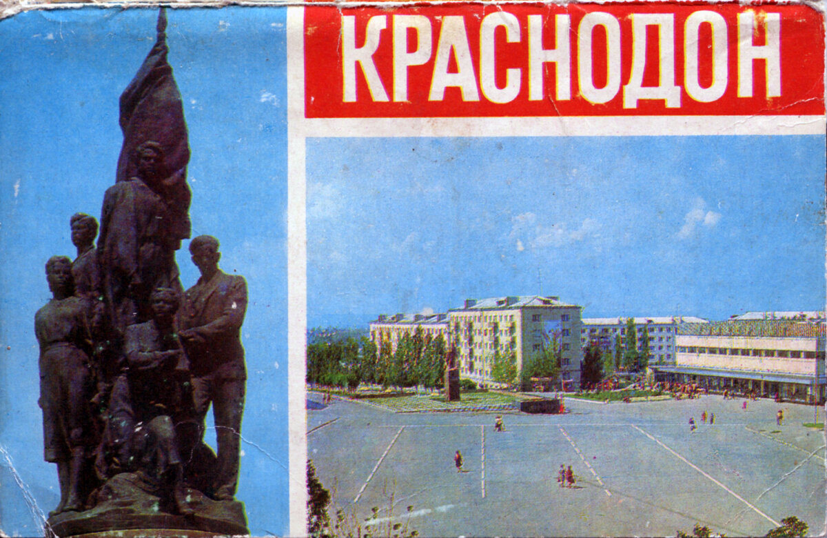 Обложка набора открыток. Фрагмент памятника "Клятва". Площадь им. Ленина. Памятник В. И. Ленину Памятник героям-молодогвардейцам "Клятва" Музей "Молодая гвардия" Кинотеатр "Юбилейный" Центральный универмаг Новостройки города Клуб им. Горького Краснодон. Боевая машина из танковой колонны "Молодая гвардия". Шурф шахты №5 - место казни молодогвардейцев Гостиница "Турист"