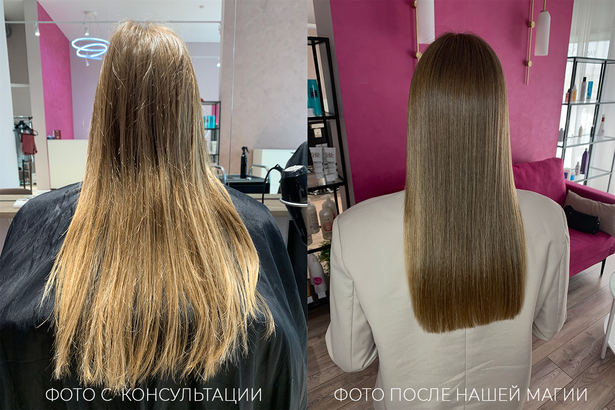 Помогла ей выявить ее тип кожи головы и подобрать шампунь, кондиционер и несмываемый уход, который подойдёт для ее тонких секущихся кончиков. Домашний уход выбираю, исходя из потребностей гостьи.