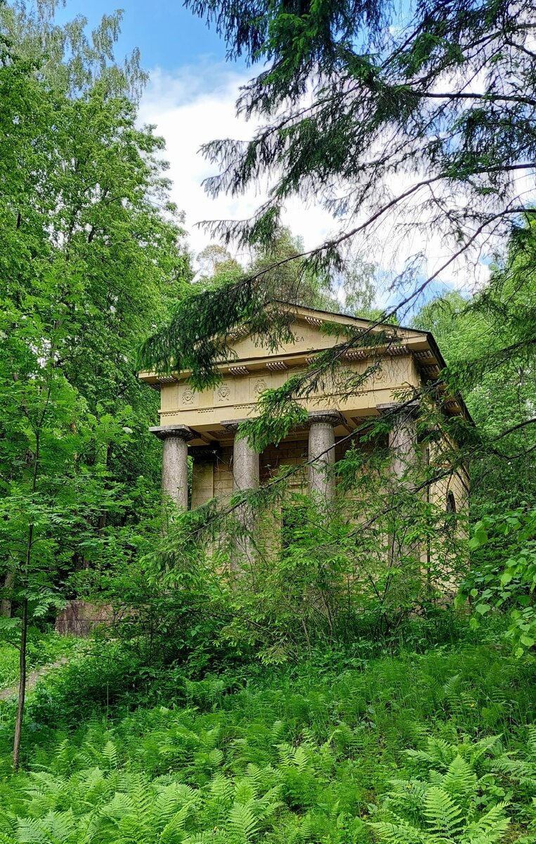 Мавзолей «СУПРУГУ-БЛАГОДЕТЕЛЮ» Расположение: Павловск, Павловский парк. История создания Мавзолея начинается с убийства заговорщиками Императора Всероссийского Павла I в 1801 году в Михайловском замке Санкт-Петербурга. Его вдовствующая супруга Мария Фёдоровна, проживающая в Павловске, решила увековечить память покойного мужа. В 1805 году она утверждает проектную работу архитектора Тома де Томона и в 1806 году начинается строительство Мавзолея, продолжавшееся до 1810 г. Это не усыпальница Императора, а ложное надгробие (кенотаф), Павел I как и все члены императорской фамилии, погребен в Петропавловском соборе Санкт-Петербурга. Мавзолей расположен в глубине Павловского парка, в трудно проходимом лесу, на берегу оврага. Построен в форме маленького греческого храма, на фронтоне дверного проема которого выполнена надпись - «Супругу-Благодетелю». Внутреннее помещение Мавзолея оформлено в аскетичной манере, всё внимание притягивает монумент - скульптурная композиция из белого мрамора в вид