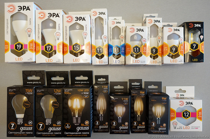 В магазинах можно встретить множество мощных светодиодных ламп, например «свечки» и «шарики» 9 и 11 Вт. Вот филаментная свечка и шарик Gauss, на которых написано «11 Вт». Знаете, какая у них на самом деле мощность? 4.7 Вт! Это в 2.3 раза меньше, чем обещано! На коробках этих лампочек указано, что они дают 720 лм и заменяют 80-ваттные лампы накаливания. На самом деле они дают 590 лм (тут соврали лишь на 20%) и заменяют 60-ваттные лампы. Ещё одно враньё с индексом цветопередачи: указано CRI>90, на самом деле лишь 8 А вот свечка и шарик Эра. На коробке — 11 Вт, 880 лм, замена 100 Вт. На самом деле 7.5 Вт, 580/642 лм и эквивалент 60 Вт. Тут с мощностью и световым потоком соврали на треть, а с эквивалентом на 40%. Я протестировал уже 2500 моделей светодиодных ламп и на сегодня, 25 февраля 2019 года, зафиксированы следующие максимальные мощности и световые потоки ламп разных типов (больше не получается сделать по техническим причинам). Запомните эти цифры! Если вы видите в магазине лампу, на