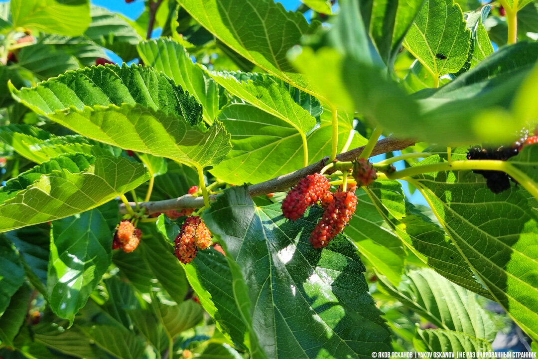 Ну, что? Лето настало и наш сад начал постепенно отдавать плоды вложенного в него труда. Сезон начался с шелковицы, которую на Дону мало кто называет "шелковицей". Более обычное для нас название – "тютина", которое очевидно происходит от "тутовое дерево". Думаю, большинство из моих читателей пробовали этот плод, если бывали в июне на юге страны. Плоды очень сладкие, сочные, с несильным но характерным ароматом. Из них часто делают вино. Но я решил насобирать их для вареников. Вино, на мой взгляд, всё же лучше делать из винограда. Тютину лучше есть в свежем виде, или сделать из неё вареники. Собирается она довольно легко, но имеет одну неприятную особенность. Сок спелых ягод сильно красит вещи и кожу. Невозможно собрать плоды, чтобы руки не посинели. Так что, для особо пекущихся о своём имидже лучше собирать урожай в перчатках. Да и одежду лучше брать рабочую. Достаточно одной спелой ягоде упасть ткань и останется пятно бардового цвета. Как делать вареники я писать не буду. Думаю, что х