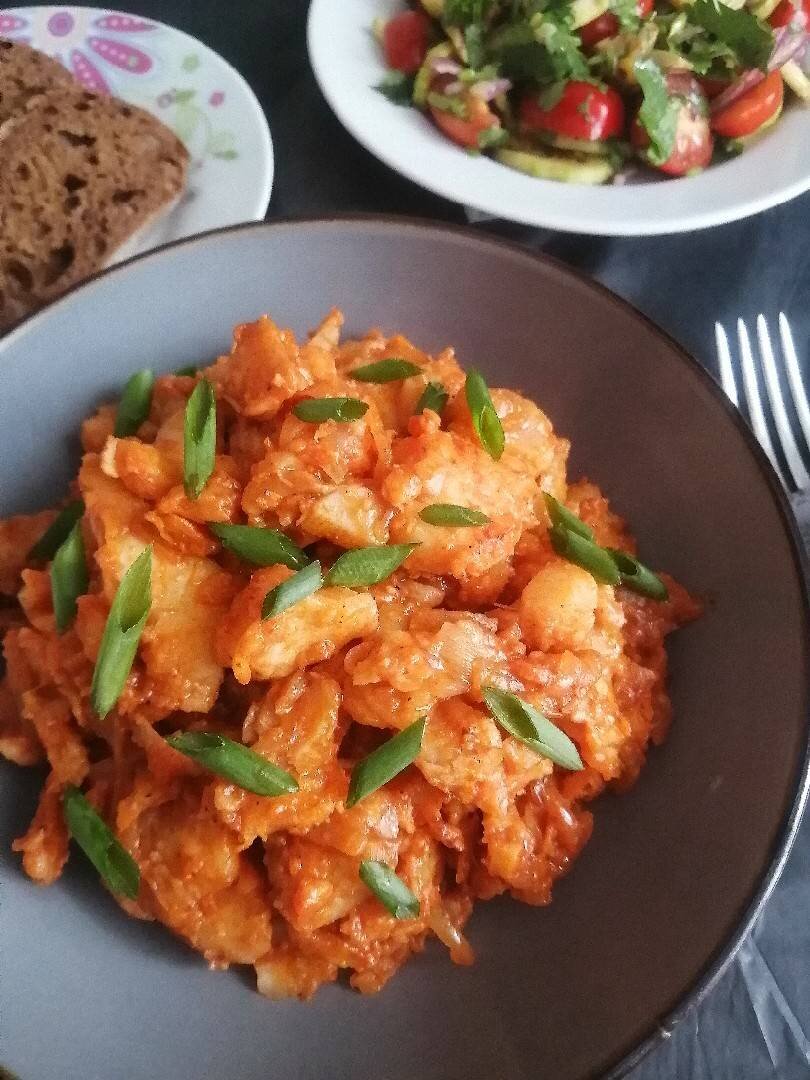 #летнееменю #пп Ингредиенты: филе трески, лука репчатого, томат-пасты, чеснока сушеного, масла растительного, Соль, Перец чёрный молотый, Мука для обваливания рыбы Способ приготовления: Филе моем, просушиваем бумажным полотенцем. Нарезаем на кусочки, добавляем чеснок сушеный, солим и перчим. Оставляем минут на 10. Лук чистим, моем и нарезаем тонко. Кусочки рыбного филе обваливаем в муке. В сковороде разогреваем масло, выкладываем рыбу и обжариваем на сильном огне 2-3 минуты, затем добавляем лук. Через пару минут добавляем томат-пасту и снижаем огонь до среднего. Готовим ещё 5-7 минут до готовности, периодически перемешивая. Подаём поджарку с гарниром, в идеале - с картофельным пюре.