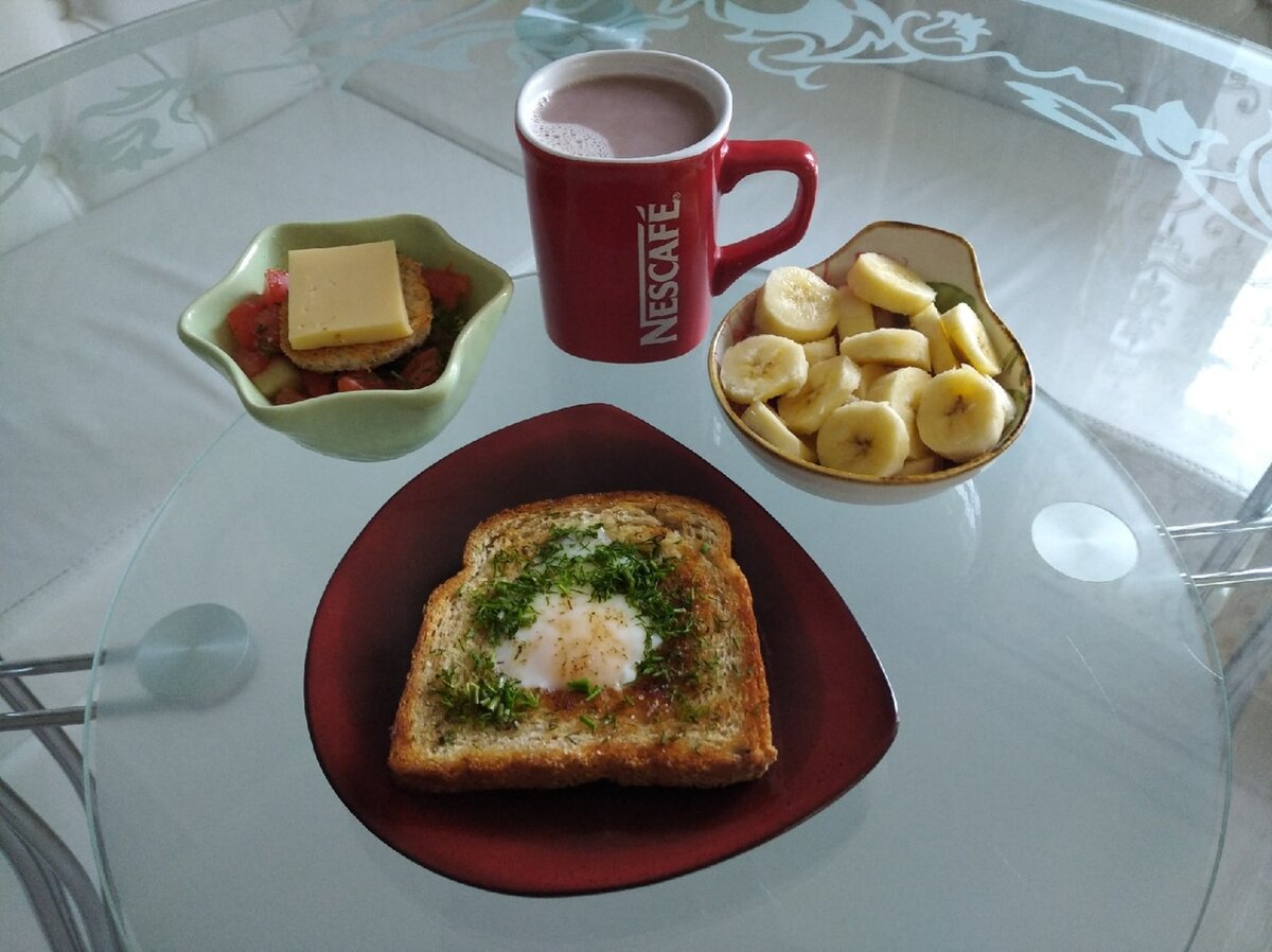 хлеб отрубной (29г), яйцо (48мл), сливочное масло (5г), огурец (51г), помидор (31г), укроп (4г), сыр (14г), банан (120г) и какао (180мл) с молоком (50мл) Общая калорийность: 410 ккал. Б - 16,4 Ж - 15,3 У - 51,6.