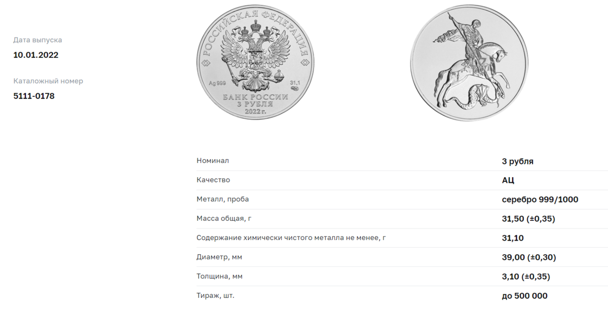 Давайте возьмем одну из самых популярных монет - серебряный Георгий Победоносец: