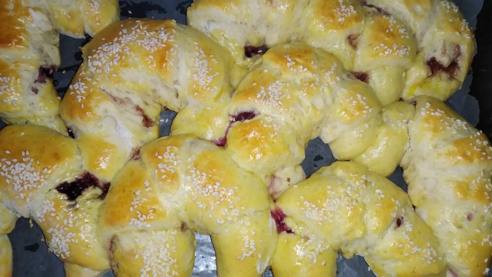 Ингредиенты: борошна, молока, масла, яйце, сухих дріжджів, цукру, солі, Варення з вишень, Яйце та кунжут для змащування зверху Способ приготовления: Готуємо опару. Підігріваємо молоко, виливаємо у миску. Додаємо до нього дріжджі та 7 ст. л. борошна, перемішуємо та ставимо у тепле місце на 15 хв. Як опара буде готовою, то додаємо до неї сіль, яйце, цукор та борошно. В кінці додаємо розтоплене масло. Тісто має бути м'яким. Ставимо у розігріту та вимкнену духовку на 1 год, щоб піднялося. Тісто ділимо на 2 частини. Розкачуємо кругом та ріжемо, щоб утворилися трикутники, Кладемо вишневе варення. Завертаємо у формі рогалика та даємо форму півмісяця. Змащуємо яйцем та посипаємо кунжутом. Випікаємо 25 хв при температурі 180°. Смачного ♥️