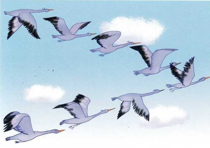Шестилетний Сережа кормил гусей во дворе и пел веселую песенку: - «Жили у бабуси Два веселых гуся: Один — серый, Другой — белый — Два веселых гуся». Гуси толпились возле скамейки, на которой сидел Сережа, смешно вытягивая шеи, и каждый старался первым схватить вкусняшку. Сережа бросал им кусочки морковки, которую сам же и грыз. В это время в отдалении раздался какой-то шум, и Сережа задрал голову: высоко в небе летели дикие гуси, выстроившись клином. - Интересно, почему гуси летают именно клином? – задумчиво произнес Сережа. - Гуси и другие птицы выстраиваются в косяк для облегчения полета! – вдруг ответил один из гусей. - Так проще преодолеть сопротивление воздуха. Косяк - это же треугольник, и острый уголок рассекает воздух, как нож - масло. - Труднее всего вожаку! Им становится самый опытный и сильный лидер стаи! – добавил второй Гусь. - Размахивая крыльями, вожак как бы разрезает воздух, следующая птица делает то же самое, но с меньшими усилиями. И так по цепочке. Потому самые силь