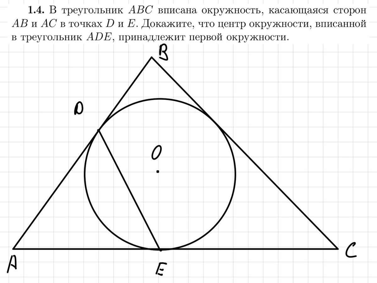 Прежде чем решать далее, давайте вспомним, что центр вписанной окружности находится на пересечении биссектрис. Таким образом нам надо доказать, что биссектрисы треугольника ADE будут пересекаться на первой окружности Для этого проведем биссектрису АО и достроим до прямоугольного треугольника, проведя радиус OD и обозначив угол DAO через α. Тогда угол AOD будет 90-α. Угол ADE так же 90-α Теперь проведем DK и получим равнобедренный треугольник KDO, у которого угол DKO будет 45+0.5α