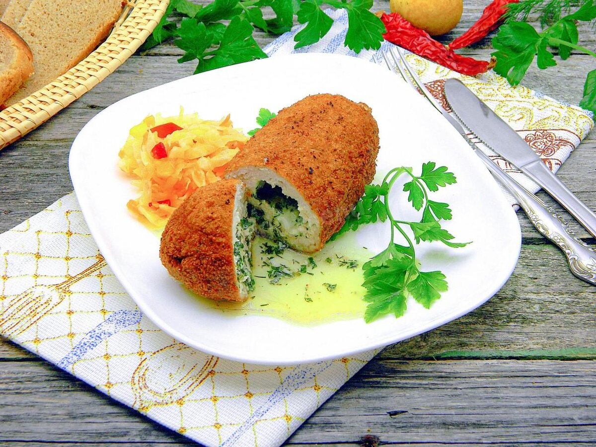 Если видите, что котлеты слишком быстро темнеют, убавьте огонь. Обжаривайте их до румяной корочки со всех сторон. У меня на каждую сторону ушло примерно по 2 минуты. Готовые котлеты выложите в жаропрочную форму и поставьте на 15 минут в разогретую до 180 градусов духовку. Там они окончательно доготовятся. Подавайте котлеты по-киевски с любым гарниром, обязательно в горячем виде.