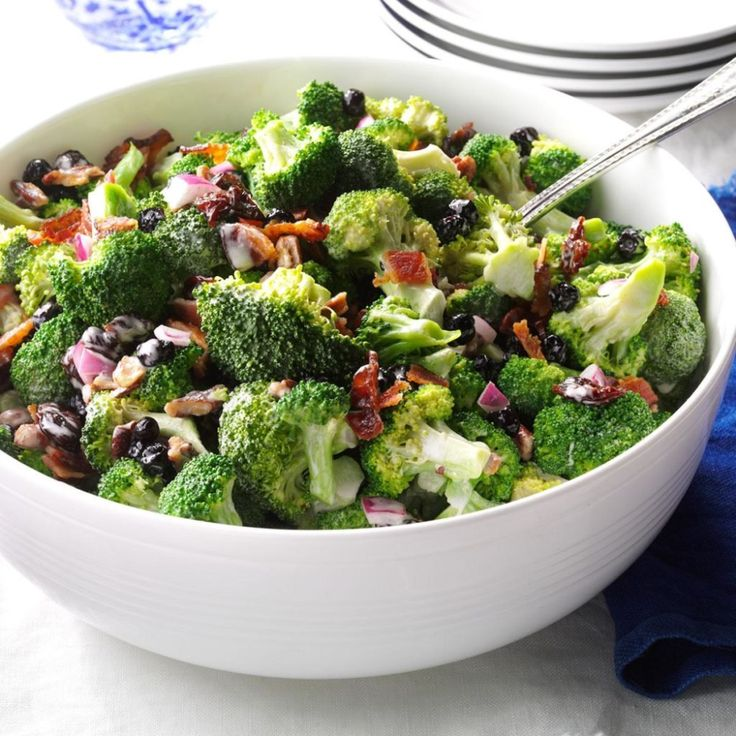 Не спешите делать выводы, пока не попробуете) Ингредиенты: Брокколи — 4 шт Лук красный — 1/2 шт Бекон — 200 гр Майонез , соль, перец — по вкусу Уксус винный — 2 ст. л Изюм — 2 ст. л (по желанию) Орехи — 2 ст. л (по желанию) 1. В сковороде разогреть совсем немножко масла, добавить нарезанный кубиками бекон. Обжарить на среднем огне до коричневого цвета бекона. 2. Соцветия брокколи нарезать на маленькие кусочки. Лук очистить и тоже мелко нарезать. 3. Смешать бекон, брокколи и лук. При желании, можно добавить в салат орехи и изюм - но это на любителя. 4. Смешать майонез, уксус, соль и перец до получения однородной массы. Получившейся смесью заправить салат, хорошенько перемешать. 5. Дать салату настояться в холодильнике хотя бы полчаса, после чего салат из брокколи можно подавать.