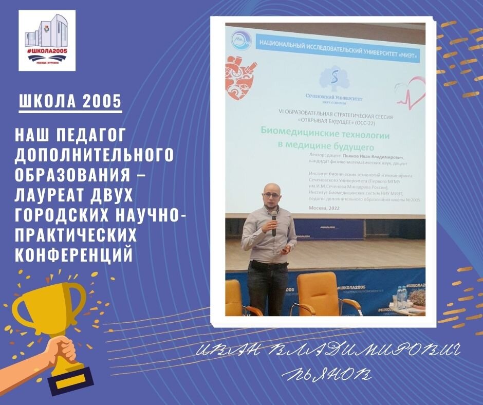 Радостные новости. 🎉 В городских научно - практических конференциях не только ученики принимают участие со своими инновационными проектами, но и педагоги школ Москвы представляют авторские программы курсов, делятся опытом научно-исследовательской деятельности в рамках развития предпрофессионального образования. 🎓Педагог дополнительного образования нашей школы Иван Владимирович Пьянов, кандидат физико - математических наук, доцент, преподаватель Института биомедицинских систем Национального исследовательского университета «МИЭТ», преподаватель Института бионических технологий и инжиниринга Сеченовского университета стал впервые в истории школы победителем и призёром двух научно-практических конференций. 🎤«Мне сказали, что мой случай уникальный. В истории Департамента образования и науки города Москвы ещё не было педагога, ставшего лауреатом сразу двух предпрофессиональных конференций в один год», - рассказал Иван Владимирович. 🏆Молодой учёный завоевал диплом победителя в секции
