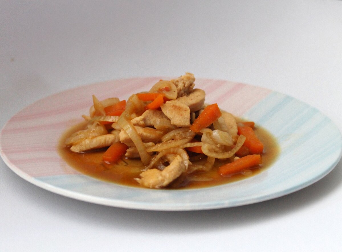 Кусочек куриной грудки, овощи и соевый соус — всё, что нужно для вкусного ужина. Готовится за считанные минуты и подходит к любому гарниру. Очень люблю этот рецепт за его простоту и универсальность. И вроде ничего выдумывать не надо — просто курица, но получается она как-то по-особенному. Оригинальность ей придаёт соевый соус и форма нарезки. И вот уже привычный продукт играет новыми «красками». 🛒Ингредиенты: ✔️ Куриное филе — 1 штука примерно 300 грамм ✔️ Лук — 2 штуки ✔️ Морковь крупная — 1 штука ✔️ Соевый соус ✔️ Растительное масло для жарки 🥣Приготовление: 1.Очищаем овощи, нарезаем лук полукольцами, морковь режем брусочками. 2.Куриное филе промываем, обсушиваем с помощью бумажного полотенца и нарезаем некрупными полосочками. 3.Разогреваем сковороду и обжариваем кусочки курицы на растительном масле. 4.Когда жидкость на сковороде полностью испарится, добавляем лук и морковь и обжариваем их вместе с курицей около 2 минут. 5.Наливаем в сковороду воды так, чтобы она покрывала с
