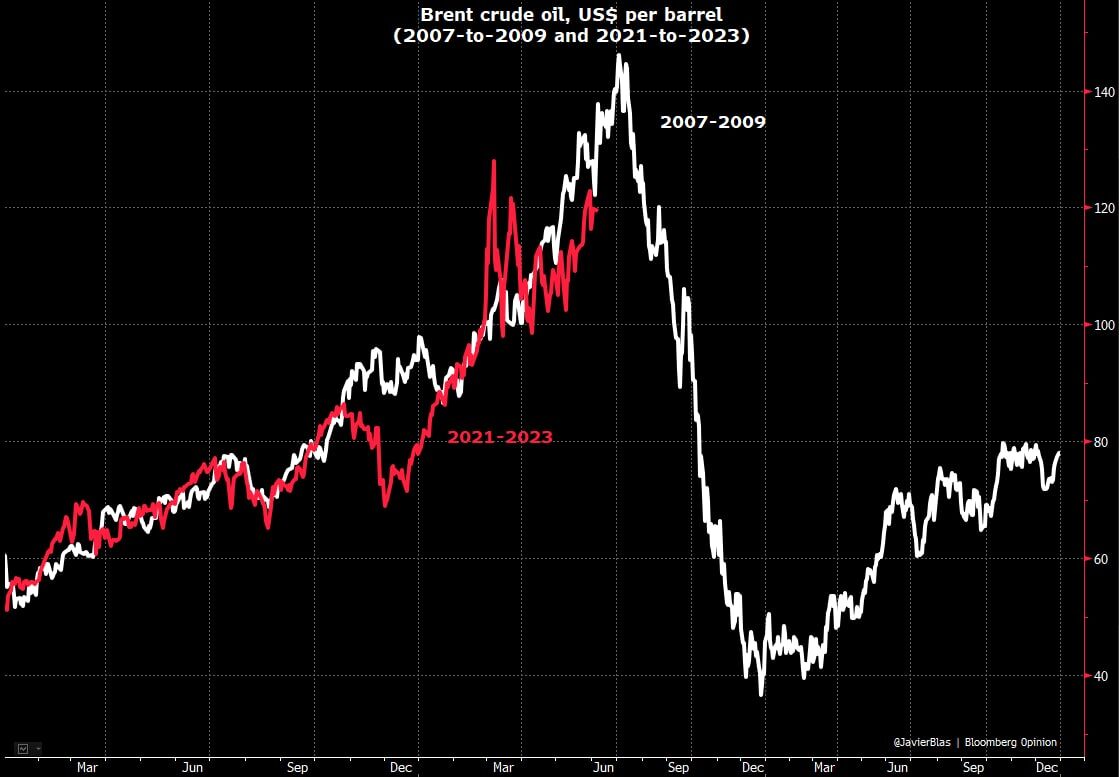 📈Как вам такая динамика? 🟠ТОГДА: ▪️ ошибочная концепция "пика добычи нефти" транслировалась через все глобальные СМИ ▪️ пузырь в активах, вызванный жилищным/ипотечным кризисом 🟢СЕЙЧАС: ▪️ дефицит предложения: недоинвестирование в добычу с 2014г (зеленая повестка); санкции/эмбарго Иран, Венесуэла, РФ От высоких цен на энергоносители одно спасение - рецессия. Время ещё есть⬇️