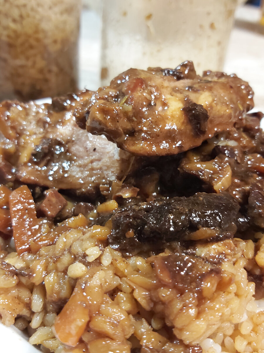 Coq au vin - французское блюдо. Как и большинство знаменитых блюд Франции, вышло "из народа". Крестьяне часами вываривали петуха, чтобы хоть как то размягчить его мясо и сделать пригодным к употреблению, а так как вина во Франции всегда было в изобилии, то томить его решили именно в нём! В современном рецепте петуха конечно же заменила курица, то медленное томление в вине никуда не делось. Особую изысканность блюду придают сухофрукты - изюм и чернослив. В оригинале на их месте должны быть курага и инжир, но в нужный момент в наших деревенских магазинах они отсутствовали. Состав "ПЕТУХА в ВИНЕ": мясо курицы (крылья), бекон сырокопченый, морковь, лук репчатый, чернослив, изюм, вино красное сухое, рис. Специи: перец черный крупного помола. Порция довольно большая, около 500 грамм - вполне хватит на двух человек или на одного здорового мужика! Рис в этой партии получился слегка альденто, но если содержимое банки хорошенько размешать, чтобы рис пропитался соусом и потом разогреть, то получ