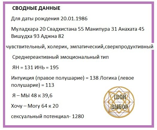Ведущая чакра-Вишудха-93 и Аджна-82. Вишудха говорит о том, что человек будет пробивать свою реализацию через творчество и голос (при этом, это вовсе не означает, что он хорошо поёт). А Аджна говорит, что человек умеет мыслить рационально и выгодно вкладывать деньги и усилия. Но высокая Вишудха может говорить ещё и о том, что рациональность будет иногда «сбоить», и человек многое будет решать повышением голоса- отсюда склонность к крикливости и скандальности, поскольку в руках себя держать сложно при Манипуре 31 (но, опять же, научиться этому можно).