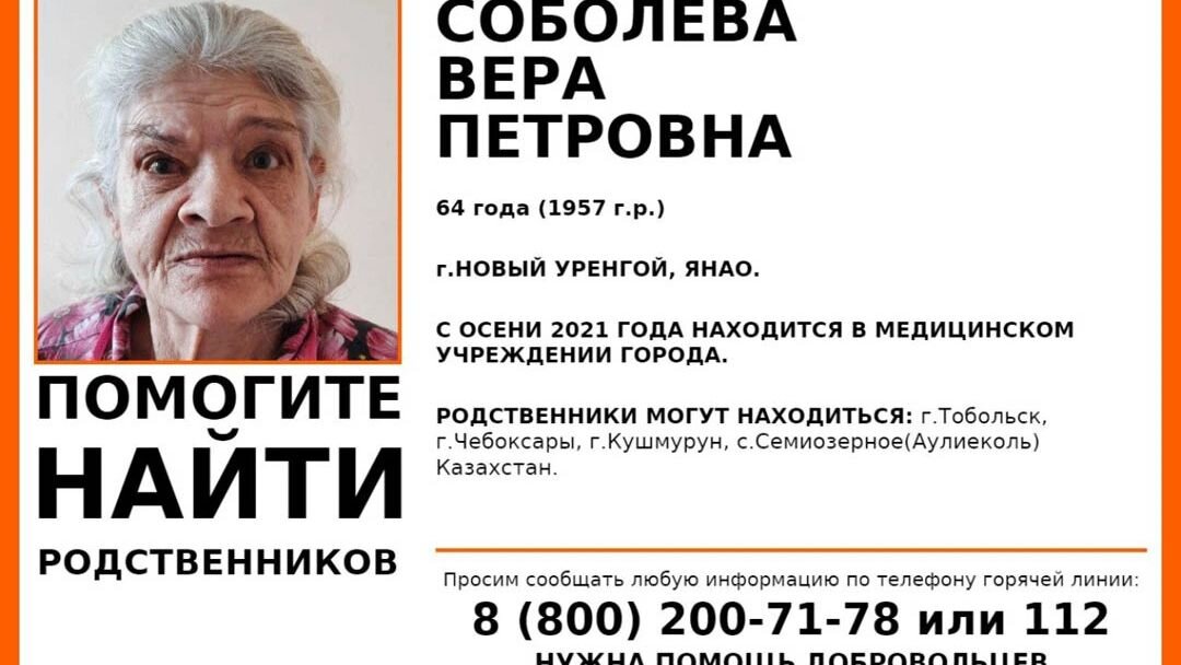 Поисковики просят сообщать информацию о родственниках женщины по телефону горячей линии. Поисковики отряда «Ямал» ищут родственников жительницы Нового Уренгоя. Вера Соболева с осени прошлого года находится в медицинском учреждении. Об этом сообщается на странице поискового отряда во «ВКонтакте». Известно, что женщине 64 года. Поисковики призывают сообщать информацию ее о родственниках по телефону горячей линии ДПСО «ЯМАЛ» 8-800-200-71-78 или 112. Ранее сообщалось, что в Новом Уренгое ищут пропавшего 45-летнего мужчину. В последний раз он выходил на связь 22 мая. Еще один человек пропал в Ноябрьске. Самые важные и оперативные новости — в нашем Telegram-канале «Ямал-Медиа».
