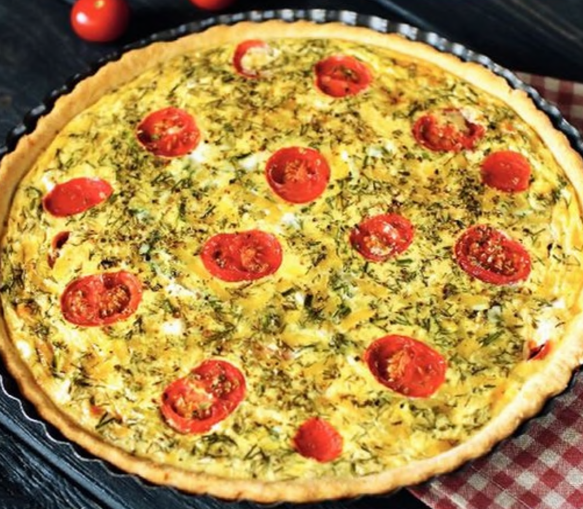 - Залить начинкой, сверху положить остальные помидоры, посыпать травами и выпекать при 180 градусах около 40 минут, затем дать остыть.