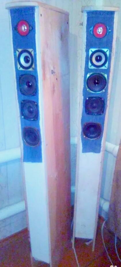 С тех времён ещё валялись среднечастотные мелкие динамики от китайских пластиковых колоночек, из доски шириной 10см сделал такие столбики. Внутри небольшой лабиринт, пародия на четвертьволновый резонатор (TQWP). Объём столбиков примерно 23л. Добавил переключатель импенданса (динамики или все последовательно, или попарно-параллельны): Решёток не было, натянул верёвочки.