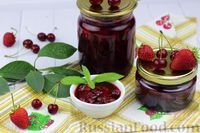 Продукты (на 7 порций) Вишня - 300 г Клубника - 300 г Сахар - 400 г Шаг 1.Подготовьте все ингредиенты. Вишни для варенья используйте целенькие, не порченные. Ягоды у меня маленькие и сочные. Шаг 2. Хорошо промойте вишни под проточной холодной водой. Чтобы проверить ягоды на наличие маленьких беленьких червячков, залейте их холодной водой с солью (на 1 л воды - 1 ст. ложка соли) и подержите около часа. За это время вся "живность" всплывёт на поверхность. Специальным приспособлением удалите из вишен косточки. Можно взять булавку и той стороной, где завиток, извлекать косточки. Шаг 3. Клубнику очистите от чашелистиков. Хорошо промойте под проточной холодной водой. Шаг 4. Разрежьте клубнику на 2-4 части, в зависимости от размера. Шаг 5. Для варки варенья используйте посуду с толстым дном, чтобы посуда не окисляла продукты. Я воспользовалась чугунным казаном. Выложите ягоды в кастрюлю и пересыпьте сахаром. Оставьте на 1-1,5 часа, можно больше, чтобы они пустили сок. Шаг 6. Тем временем подг